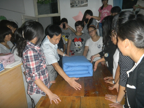 为加强校风校纪建设,维护学校正常的教育、教学和生活秩序,进一步加强学生公寓管理和服务工作,给学生创造一个安全、整洁、舒适的学习和生活环境,养成良好习惯。2013年9月9日晚在辅导员赵晋田老师的带领下,高职护理1301班在k楼108教室组织开展内务管理主题班会,并组织学生集体学习叠被子。