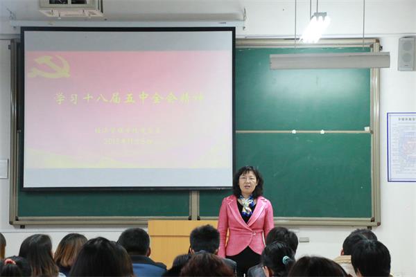 会议围绕学习党的十八届五中全会精神展开。会议刚开始,一个关于高晓兵同志的在高等学校党的建设工作视频,让全体教职工明白了建设工作的重要性。会议第一项由书记围绕党的十八届五中全会精神对工作做了讲解,第一要强化党性自觉、提升忠诚境界,进一步增强办好中国特色社会主义大学的精神动力。第二要增强改革意识、提升治理境界。第三要加强领导指导、提升治理能力。对于以上几点要求,赵昆书记强调要进一步推动解决高校党建设工作中的实际问题。接着,由王广柱院长对教职工应做什么、应该如何做等问题做了详细地教导。首先,教师应提高自身素质,让自己做好学生的榜样。其次,应注重学生到课率、课堂效率等问题。对于学生在校期间遇到的问题,要及时检查并加强管理。紧接着张黎院长对教师教学工作做了指导。教师应把国家发展、未来规划灌输给学生,在选题、验题方向应围绕国家发展。最后,王广柱院长对近期运动会做了总结,同时也提出了明年的奋斗目标,希望明年的运动会经管学院能取得更好的成绩。
