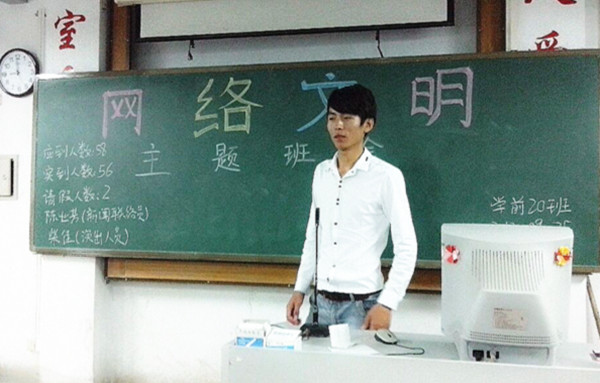 为了喜迎校庆15周年,9月27日,学前教育学院2013级学前二十班同学在教室开展了以“网络文明”为主题的班会,此次班会由班长王强民和团支书谢冬竹主持。开展此次主题班会的目的在于引导同学们正确认识网络,合理、正确利用网络,健康上网,文明上网,构建文明和谐校园。