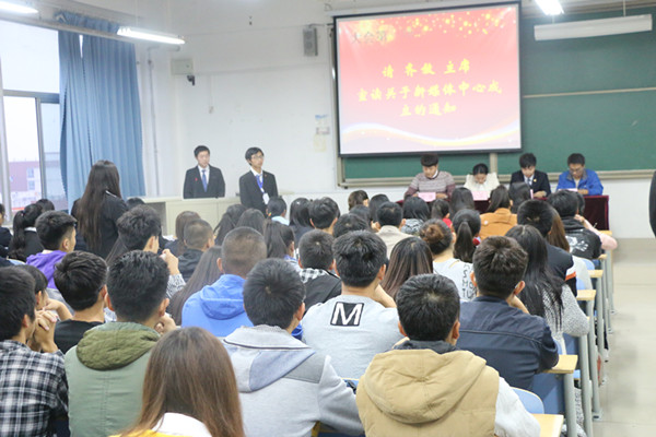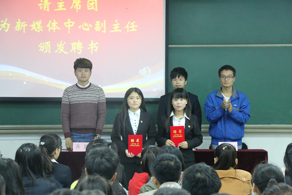 首先由齐放主席宣读成立大会通知,并宣布新媒体中心的正式成立。黄涛副书记宣读主任、副主任任命通知:任李乾为新媒体中心主任,张琳琳、赵艳、张亚茹、薛凯良任副主任。主席团为主任、副主任颁发聘书。会议最后,基层团委书记赵昆对新媒体中心提出工做要求。赵昆书记指出,新媒体中心的成立具有重要意义,高校宣传思想工作压力巨大,而伴随着新媒体的持续深入发展,对学生的思想行为方式产生了不可忽视的影响,我们要让新媒体成为创新网络思想政治教育的重要手段和途径。她要求宣传工作要做好“一网三微”,尤其是微信、微博平台的运用,将新媒体和传统媒体相结合,多位一体,联动传播,融合发展。要求新媒体题材具有广泛性、严谨性和正能量性。