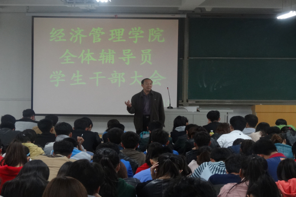 新学期,新气象。为了巩固和落实新学期的各项工作安排,明确经济管理学院的各项工作计划。2103年10月14日下午6点20分,经济管理学院于教学楼B-200组织召开全体辅导员学生干部大会。经济管理学院行政院长王广柱组织召开此次大会,全体辅导员和各班班长团支书以及全体基层团委学生会干部应邀参加本次会议。