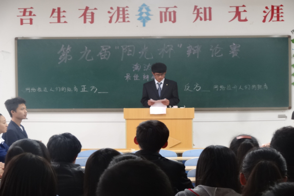网络是一把双刃剑,同学们对网络有着不一样的看法。2013年10月14日中午11:40,经济管理学院于教学楼B-511举行第九届“阳光杯”辩论赛初赛。优秀辅导员张浩老师、学习部部长王军及12级最佳辩手王新友学长应邀作为出席嘉宾。部分经济管理学院2013级新生参与比赛。