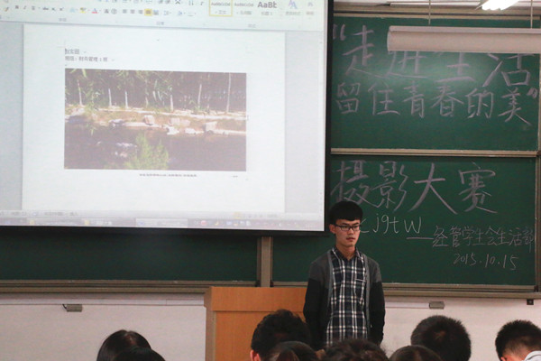 2015年10月15日11:50由基层团委学生会生活部组织的“走进生活,留住青春的美”摄影大赛,在经管楼B楼504教室正式开始。此次活动的组织者有经管学院学生会生活部任涛、郑鑫、赵艳丽、李静等副部长。