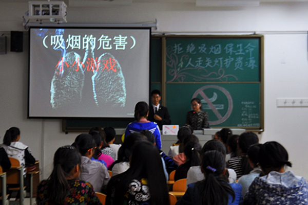 总所周知,不管是一手烟还是二手烟对人体的危害都很大,尤其是二手烟,危害甚至更大于一手烟。吸烟更使每年大约有100万人死亡,其中青少年吸烟导致死亡的比例持续上升。会上,主持人播放了不吸烟的人的肺部照片和吸烟的人的肺部照片,强烈的颜色对比冲击着同学们的视线,常年吸烟的人的肺部照片更是让人不忍直视。针对吸烟的危害,主持人提出了一个非常现实的问题,“如何拒绝吸第一支烟?”同学们陷入沉思,在这个靠关系的社会,吸烟成为拉近关系的重要途径,那么该如何婉拒递到手边的烟呢?一个接一个问题,将班会的气氛提升到一个新的高度。