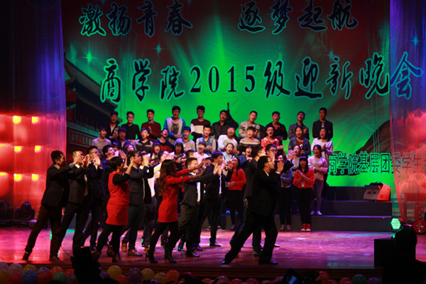 晚会在摇滚乐《无地自容》中拉开帷幕,音乐开始就把晚会带进了一脱口秀节目《带你去韩国》,是由2014级的学长姜泽禹特地为迎接新生的到来准备的。刚一出场,略带喜感的表情和夸张的语个高潮阶段,把观众的热情都带动起来了。接着,开始了晚会的第一幕“迎新商学 放梦飞翔”。健美操《舞动青春》充分展现了大一新生的活力与激情;歌曲《想把我唱给你听》把观众带进了一个温馨的氛围;接下来由商学院艺术团街舞部带来的的机械舞《keep on dancing》展现了他们非凡的舞技,赢得观众的一片叫好之声;对唱歌曲《绿军装的梦》也获得了一片好评;在我们欣赏完歌舞之后,终于迎来今晚的第一个气就赢得了现场的一片好评与掌声。在欣赏完了脱口秀之后第一幕在一首《红星叫我去战斗》中结束。接着,第二幕“莘莘学子,青春激扬”在由商学院艺术团街舞部带来的《自由之战》中开始,富有节奏感的舞姿赢得现场的阵阵欢呼。接下来的歌曲《南山南》、小品《碰瓷儿》、萨克斯经典歌曲独奏和流行歌曲串烧也为晚会又一次带入了高潮。