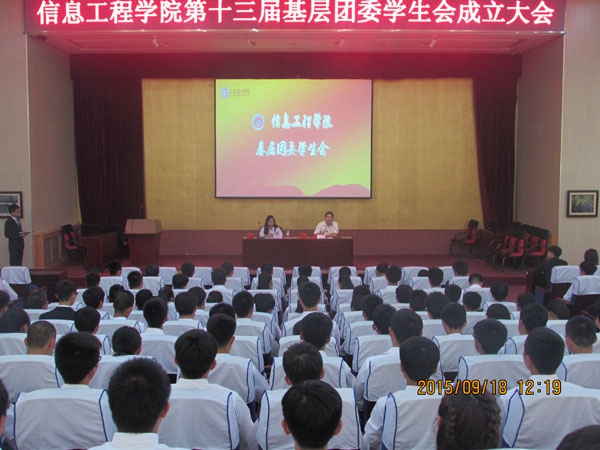 在秋风阵阵的季节里,我们迎来了新的学期,而信息工程学院基层团委学生会也迎来了一批新鲜血液。2015年9月18日,我院在学术报告厅隆重举行了第十三届信息工程学院基层团委学生会成立大会,出席本次会议的有:行政院长赵全华和团委书记米晓青。