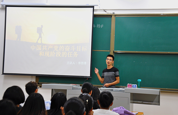 2015年9月23日晚,学前教育学院在学前教育新楼举行2015-2016年度第一期入党积极分子培训班第四讲,主要围绕中国共产党的任务,奋斗目标为主题进行。该培训由学前辅导员李圣锋老师作为主讲人,本期全体入党积极分子参与。