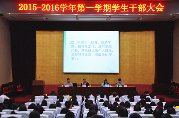 2015年10月9日晚六时,学前教育学院2015-2016学年第一学期学生干部大会在我校学术报告厅隆重举行。行政院长郑雯、基层团委书记王坤丽、行政秘书曹鹏、行政秘书沈汉赋出席了此次大会,基层团委、学生会骨干及2015级各班学生骨干参加了此次大会。