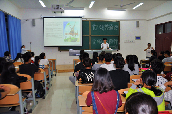 在此次活动中,主持人用PPT为同学们展示了主要内容。为了深化主题,主持人通过普通话的概论,普通话的起源,方言笑话,绕口令,一段动画片等丰富的内容向大家传递讲普通话的概念。过程中进行的小游戏,很大程度上调动了同学们的积极性,提高了他们的听讲效益。从个人到社会,主持人用身边真实的故事表明“说好普通话,方便你我他”这一句话的含义。随后,主持人通过这一话题进行延伸,提出了礼貌和尊重的问题。