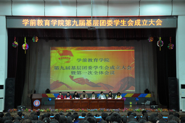 围绕“一样的青春,不一样的未来”展开的学前教育学院第九届基层团委学生会成立大会于10月24日中午在大学生活动中心成功召开。出席本次会议的领导有学前教育学院行政院长郑雯、基层团委书记王坤丽,行政秘书曹鹏老师,学生党支部书记米晓青老师,10级团总支书记罗斐老师,11级团总支书记金阳老师,12级团总支书记甘娟老师,13级团总支书记陈文双老师,以及基层团委学生会各部门负责的老师们。另外,第九届基层团委学生会全体成员和2013级各班级班长团支书也列席了本次会议。