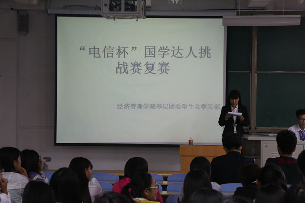 2015年9月12日中午12:00,“电信杯”国学达人挑战赛复赛在北校区教学楼B―300正式展开,本次决赛第一轮和第二轮采用两两PK,记时抢答的模式进行,六组参赛选手进行激烈地角逐,你追我赶,不相上下,最后剩下三名选手顺利进入第三轮比赛,第三轮比赛采用累计答题的模式进行,十道题目陆续呈现,三名选手冷静沉着地思考,谨慎地答题,最终完美地完成了比赛。获胜的前三名同学将代表经管学院参加学校“国学达人”挑战赛。