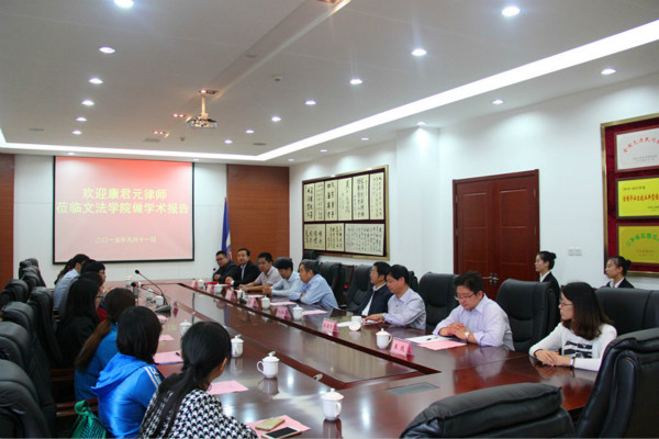 讲座前,我校张良成副院长,刘存刚副院长,北校区管委会王冠良副主任,北校区综合办于宗先副主任,文法学院宋保年院长,文法学院王珑副院长在北校区大会议室与康律师一行十人进行了座谈。座谈会由文法学院高奎副院长主持。