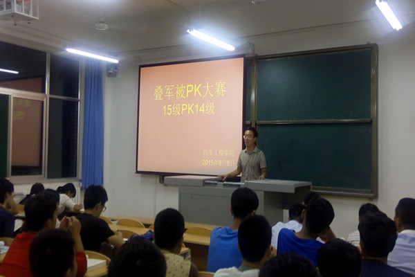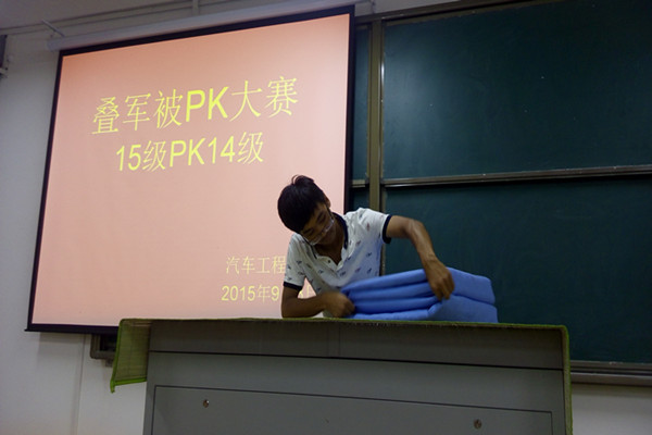 汽车工程学院响应学院学工部的号召,提前进入文明宿舍活动的准备工作,抓好学生内务整理,培养学生自理能力,规范寝室管理,营造整洁、舒适的生活环境,培养学生良好的生活习惯,9月13日晚7点10分,我院文明宿舍之内务整理“叠军被PK大赛”在汽车新实验实训楼4005教室拉开帷幕。本次大赛由汽车工程学院所有辅导员老师联合举办,大赛邀请了付高建老师、王丹老师及2015汽车新生担任大赛评委,来自汽车14级和15级各四名同学献上了一场激情饱满的PK大赛。