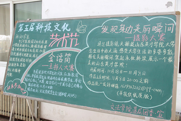 2013年11月迎来了山东英才学院举办第五届大学生科技文化艺术节,文法学院基层团委学生会做出了积极响应,主动承办了“金话筒”主持人大赛和“发现身边美丽瞬间”摄影大赛两项精彩活动,极具吸引力的宣传活动已全面展开。
