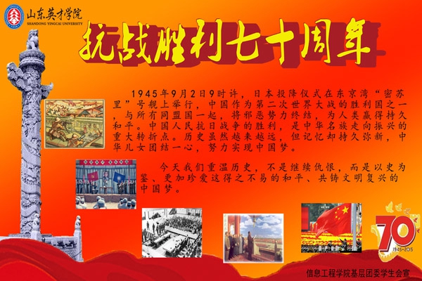 70年前救亡图存的历史任务已由我们的先辈完成,而推进中华民族伟大复兴的事业需要我们接续奋斗。站在新的起点,信息学子要在学院领导下,坚持以马克思列宁主义、毛泽东思想、邓小平理论、“三个代表”重要思想、科学发展观为指导,深入学习贯彻习近平总书记系列重要讲话精神,沿着中国特色社会主义道路,大力弘扬伟大的抗战精神,着力把这种高尚的精神境界升华为建设中国特色社会主义的理想信念,体现为践行社会主义核心价值观的自觉追求,转化为同心共筑中国梦的实际行动。要始终坚持学风建设这个不变目标,努力实现有质量、有实效、可持续的学院发展。广泛开展爱国主义教育,唤起同学们对和平的向往和坚守。要切实加强团学骨干的建设,不断提高各级组织的创造力、凝聚力、战斗力,为实现信息梦,英才梦而努力!
