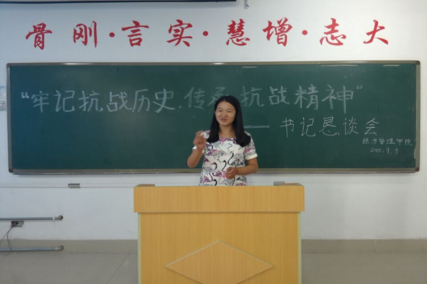 为响应全校共青团组织围绕纪念反法西斯战争胜利70周年的号召,我院积极主动开展“牢记抗战历史,传承抗战精神”书记恳谈会。我院于2015年9月5日下午19时,在教学楼B-515开展“牢记抗战历史,传承抗战精神”书记恳谈会,由经济管理学院基层团委赵昆书记主持,参加会议的有共青团各团干部。
