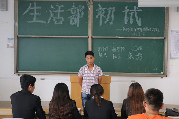 为进一步加强团学队伍建设,优化团学干部的质量,促进团学工作的进一步有序的开展,2015年9月8日中午12时,经济管理学院基层团委、学生会于教学楼B楼举行初次面试活动,经济管理学院基层团委副书记黄涛、学生会主席齐放、副主席李杨杨及各部门部长、副部长担任此次的面试官。