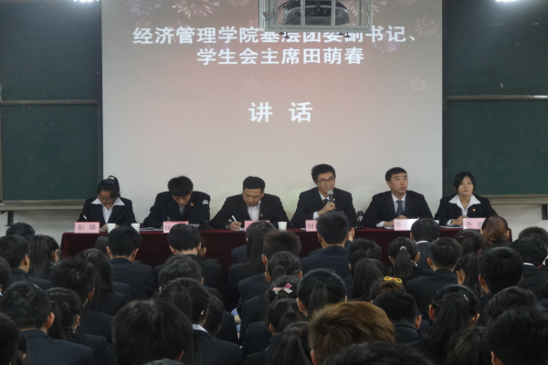 2013年10月30日12时,经济管理学院基层团委、学生会在教学楼B-100教室召开以“狠抓内部建设,规范团学队伍”为主题第三次全体团学干部会议。经济管理学院基层团委书记王鹏飞,副书记、学生会主席田萌春,副书记刘丰吉,副主席李云龙、李敏、彭婧及第十二届基层团委、学生会全体团学干部共同出席全会。会议由副书记刘丰吉主持。