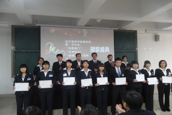 伴随着高亢嘹亮的义勇军进行曲,大会拉开帷幕。王鹏飞书记宣读《关于经济管理学院基层团委、学生会“优秀部门”、“优秀部长”、“微博先进单位及个人”和“社会实践先进个人”表彰决定》。接着,举行颁奖典礼,对获奖单位及个人予以表彰,既是对先进单位及个人工作的肯定,也是对全体团学干部的激励和敦促。