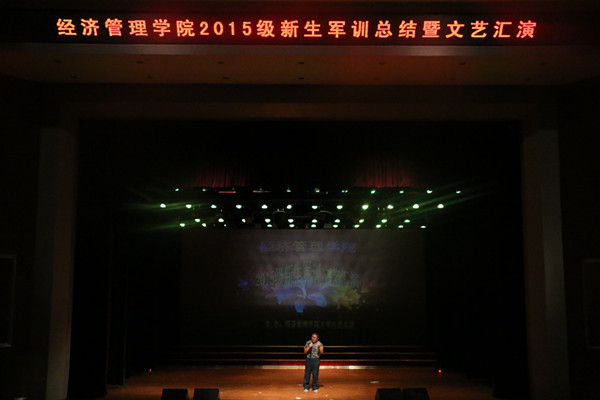 8月29日晚18:00经济管理学院在北校区大学生活动中心举办2015级新生军训总结暨文艺汇演。出席本次活动的领导有经济管理学院行政副院长王广柱,基层团委书记赵昆,行政秘书王栋栋,以及全体辅导员老师。2015级全体新生身着军训服参加了此次活动。本次活动由经济管理学院大学生艺术团主办。