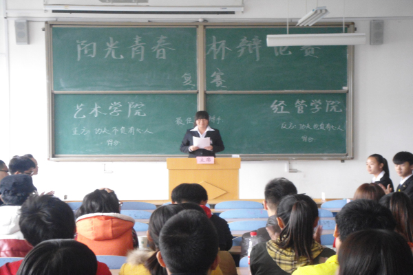 阳光无限,青春向上。由经济管理学院主办的“阳光青春杯辩论赛”复赛于2013年11月5日中午11点半在教学楼B-206教室展开。本次比赛特邀园林学院、艺术学院以及经管学院的辩论队队长做评委,在场的还有八位参赛选手和他们的啦啦队们。