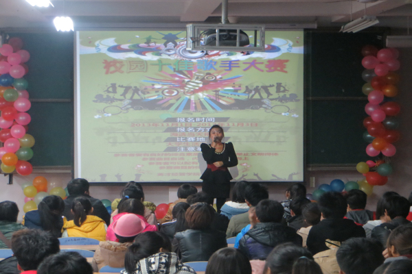 声动校园,青春展现。为充分挖掘大学生才艺,丰富校园文化,展现英才学子们的才艺魅力。经济管理学院基层团委、学生会文艺部于2013年11月15日17:00在教学楼B-100举办“校园十佳歌手大赛”复赛,出席本次大赛的评委及嘉宾有文艺部部长陆迪,副部长杨晶莉、刘向峰等。