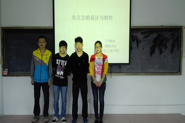 在学校公布的立项项目中,我院共有两个项目获批,分别是牛帅帅小组的光立方的设计与制作和唐靖小组的基于WEB学生专用网上商城系统的设计与实现。首先项目负责人用10分钟以PPT形式向专家组汇报,汇报的内容包括项目研究的成果及在研究过程中遇到的困难等,同时项目组还在现场以实物的方式展示研究成果。之后由答辩组专家就结题报告及展示内容对各团队进行询问与评价。各位专家认真审阅各项目结题报告和创新创业训练计划书的完成情况,同时还对各项目组中存在的问题耐心给予了客观的评价和具体的指导建议。专家们简短的话语使得学生们深受启发,为后期继续完善计划书奠定了基础。最后答辩组还给每个项目组进行评分。、答辩结束后,信息工程学院教学院长赵红艳教授召集项目组成员进行结题会总结,告诫项目组成员要依据答辩组提出的意见进行修改。