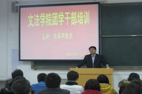 2013年11月20日午,当大多同学已经在午睡小憩时,文法学院的会议室里正在召开团学干部培训会。此次培训由文法学院基层团委、学生会组织,旨在培养骨干力量的工作能力。我们邀请到了文法学院宋保年院长担任主讲人,参加培训的有文法学院基层团委、学生会,宿管会,各班班长及团支书等人员。