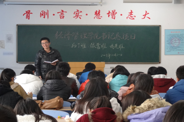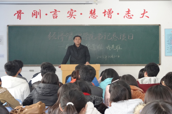 为顺应新形势,创新团学工作。 2013年11月20日 中午11:30,经济管理学院在教学楼B-507教室举办了以“为了谁,依靠谁,我是谁”的书记恳谈活动。基层团委书记王鹏飞担任主讲人,经济管理学院基层团委、学生会主席田萌春,副主席刘丰吉、李敏以及基层团委学生会各部门正副部长和13级的班级团支书参加本次恳谈活动。