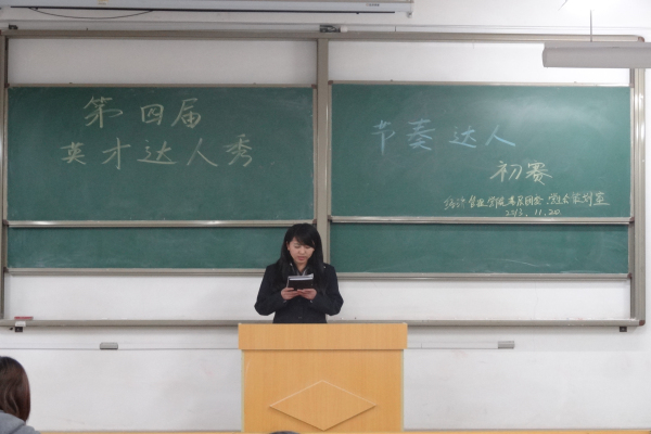 为丰富大学生生活,给同学们一个展示自我的平台。经济管理学院基层团委、学生会策划室于2013年11月21日在教学楼B-304举办第四届英才达人秀活动,出席本次活动的评委有策划室主任郑文炜、副主任胡崇芳等。