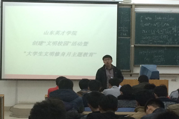 在班会上,辅导员老师以“说文明话走文明路做文明事成文明人”为班会主题,认真备课,以课件的形式向同学们讲解了行为文明、仪表文明、语言文明、教室文明、食堂文明、公寓文明、网络文明七个方面的内容,并组织同学们集中学习了《山东英才学院学生行为规范》和《山东英才学院大学生文明修身读本》,并对广大同学们提出了要求。同学们表示,本次班会受益匪浅,通过学习各种材料和文件精神,自己从思想上改变了许多,同时相信自己会从今后的行动中真正改变过来,弃掉陋习,丢掉不良习惯,积极参与到“大学生文明修身月”各项活动中去,自觉树立良好形象,养成健康文明的生活习惯和行为方式,提高自身文明素质与修养水平,推进和谐、文明班级建设。班会最后,班委带头宣读了《山东英才学院文明修身主题月活动倡议书》。