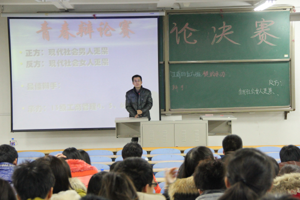 本着促进班级之间交流与沟通,加强学生语言表达能力的原则。经济管理学院13级工商企业管理4、5、6班全体同学于2013年11月24日19:00在教学楼B-200举办“友谊杯青春辩论赛”决赛,出席的嘉宾有导员张浩老师以及各班班长和团支书。