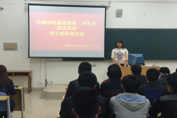 为引导帮助广大青年学生和高校团学干部进一步牢固树立对党的科学理论的信仰、坚定走中国特色社会主义道路实现“中国梦”的信念,增强对党和政府的信任、对党中央的信赖。2015年4月9日中午,机械学院基层团委、学生会在机械楼举行“四进四信”恳谈活动,参与本次活动的有机械学院基层团委常委、学生会副主席、各部门部长、副部长,本次恳谈活动由机械学院副书记邢月月主持。