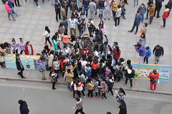 大学生活动中心前人头攒动,来往学生们积极参与,很早就排起了长长的队伍等待领取种子,现场气氛异常火爆。一个写心愿的小环节也为本次活动增添了几分光彩。工作人员忙于派发“佛甲草”绿植种子以及花盆与肥料,期间,吸引了越来越多来往学生们的驻足问津。对于现场学生们的种种咨询,场中有主持人不时宣讲关于本次活动的规则和意义,解答了他们的疑惑。