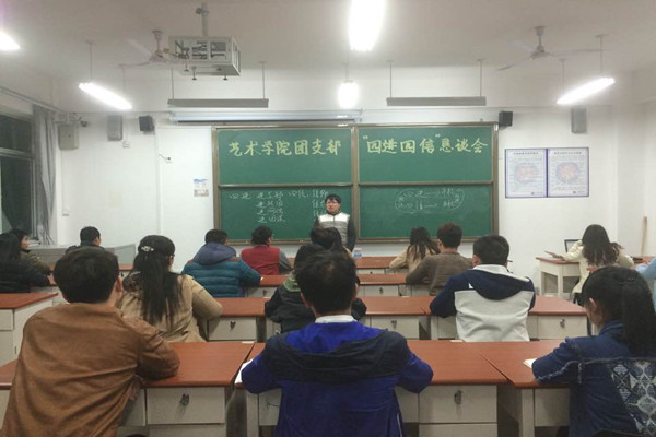 为了把习总书记的讲话精神传播得更广、更远、更深,引领和帮 助广大团学干部和同学们了解、掌握、理解、运用讲话精神,艺术学院团支部于 2015 年 4月 9日晚开展了以 “四进四信”为主题的恳谈会。艺术学院团委书记王志涛、团委副书记赵鹏飞,以及基层团委全体成员和14级学生代表出席了此次恳谈会。
