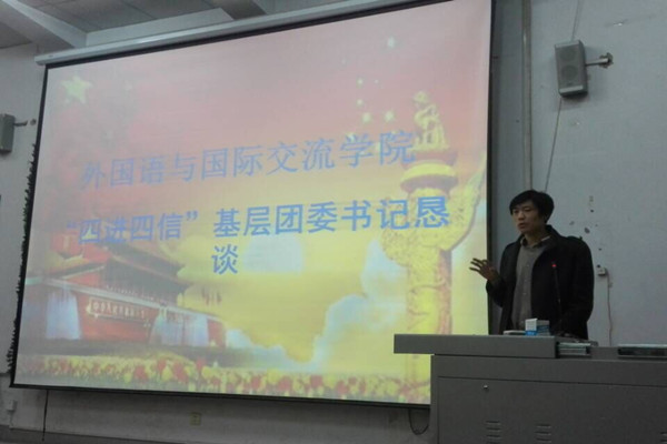 为了深入贯彻习近平总书记系列重要讲话精神,4月9日中午,外国语与国际交流学院在阶梯教室开展了“四进四信”基层团委书记恳谈活动,外国语与国际交流学院基层团委、学生会全体成员,各班班长、团支书参加恳谈活动,本次恳谈由基层团委书记祝景朋主持。