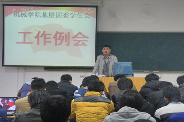 接近期末,但是机械学院的团学工作依旧在有条不紊的进行中。刘书记对上周大家的表现给予了肯定。尤其是我们机械学院承办的“机械杯”相声小品大赛取得了广大师生的极大欢迎。同时刘书记强调:各部门各团支部不要松懈,继续开展团日活动,保证临至期末校园的稳定工作。针对微信推广工作,刘书记要求负责部门要走进班级、走进宿舍,指导同学们关注我们“青春英才”微信公共帐号,及时了解校园动态。最后,刘书记再次强调各部门对自己部门举办的活动要即使形成文件材料入档,完善部门档案。