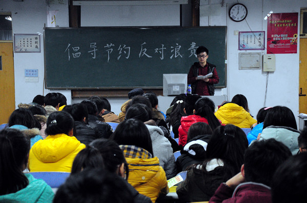 会议中,张丰首先给大家讲述了有关节约和浪费的事例,引起了同学们的强烈共鸣。接着,各班委讲述日常生活中节约的榜样和浪费的警示,向同学们分享节约的精神,同学们有的讲述自己同学浪费饭菜的情况、女生爱买衣服浪费钱、讲男生毛毛躁躁浪费水等。其中刘帅鹏同学讲述舍友节约用钱的故事最让人记忆深刻,不论去哪里吃饭那位同学总会将未吃完的饭打包带回宿舍饿了再吃,不在乎别人异样的眼光,因为他觉得浪费可耻!随后,大家又针对最严重的浪费现象,讨论除了最佳的解决方法。