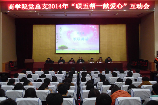 为了能让大学生有更好的学习环境和学习条件,商学院展开了党员“联五帮一献爱心”系列活动。2015年1月12日中午,山东英才学院商学院党总支在学院学术报告厅隆重举行商学院党总支“联五帮一献爱心”互动会。参加本次会议的领导有山东英才学院院长、党委书记夏季亭教授、校办公室孙玉香副处长、学工部龙新良部长、李寿杰副处长、韩芳丽副处长、商学院行政党支部支书记高强以及商学院党总支成员教工党员。本次会议由商学院基层团委书记邢辉主持。