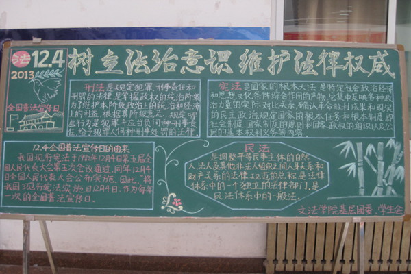 为迎接12.4全国普法宣传日,大力弘扬法治理念,树立法治意识,维护法律权威。文法学院基层团委宣传部于2013年12月1日下午利用课余时间进行了前期的宣传工作。