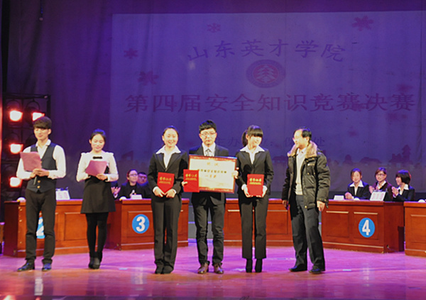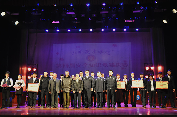 为加强校园安全知识教育,提高学生自我保护能力,2014年12月30日下午14时,山东英才学院第四届安全知识竞赛决赛在大学生活动中心隆重举行。本次安全知识竞赛决赛是由山东英才学院保卫处主办的,学前教育学院代表队与其他五个二级学院代表队在决赛现场进行了近一个半小时的激烈角逐,在比赛最后学前教育学院代表队凭借最高得分脱颖而出,蝉联了山东英才学院安全知识竞赛冠军。