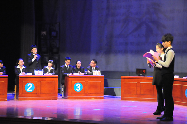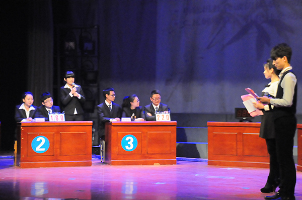 比赛共分为三个环节:必答题、抢答题和风险题。据悉,赛前各二级学院极为重视此次竞赛,均是有备而来,因此整场比赛较之往年更为激烈。比赛现场,各个二级学院的参赛选手表现得沉稳且出色,分数差距在必答环节时一直处于伯仲之间,因此比赛胜负的关键在于抢答题和风险题。在抢答题环节上,参赛选手们都开始全神贯注于听到的抢答倒计时和咫尺间的抢答器,这个时候极大程度的考验了他们的临场反应的果断性与掌握安全知识的牢固性。在此环节中,各参赛选手奋勇抢答,对答题志在必得,但也因此造成了很多诸如抢答犯规的失误而扣分连连,各二级学院代表队的比分差距频频变更,场面不仅令台上的参赛选手惊心动魄,也令台下的观众紧绷着心弦,最后学前教育学院代表队赛出了一贯的优秀水平,得分领跑全场。抢答题与风险题环节间有互动环节,台下各二级学院代表学生上台回答问题,以及行政院长为参赛选手选择问题,无论台上还是台下,学前学子在答题前经过深思熟虑,都能轻松且流畅地答对主持人提出的问题,稳稳的拿到分数,同时赢得了台下同学们真挚的掌声。比赛休息时间,学前教育学院的两位老师还为这次安全知识竞赛决赛演唱了《欢天喜地》和《锦绣前程》,歌声悠扬大气,为比赛驱除了些许凝重之感,增添了愉悦的气氛。在最后一个风险题环节中,学前教育学院代表队表现依旧沉稳又不失进取,在保证总分领先的情况下拿到了更高的分数,一直到本环节结束,学前教育学院代表队总得分排名仍居首位。