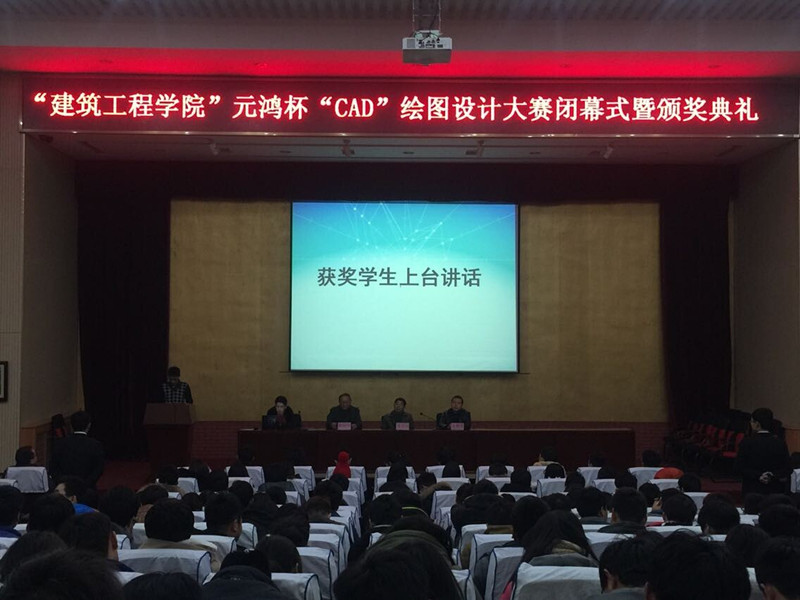2015年1月5日中午12:00,建筑工程学院由山东元鸿测绘科技有限公司主办、建筑工程学院学生党支部、建筑工程学院基层团委、学生会承办、山东鲁义信息工程有限公司协办的建筑工程学院“元鸿杯”CAD绘图设计大赛闭幕式在学术报告厅举行。建筑工程学院教学副院长沈子贞、建筑工程学院行政副院长杨庆年、建筑工程学院就业副院长王春升及此次大赛指导老师周涛老师和建工学院本科办公室辅导员出席了本次闭幕式。