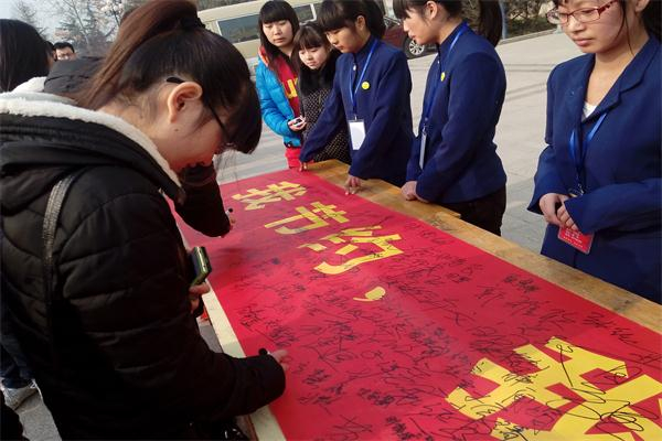 12月3日中午11:30,建筑工程学院学生会的所有干事及部长准时在C楼大厅集合完毕。之后,在部长的带领下,所有人员排队走到了A楼广场,整齐的站在楼前等待着签字。随后,他们排着队走到横幅前,在横幅上签上自己的名字,代表着自己对本次活动的支持。