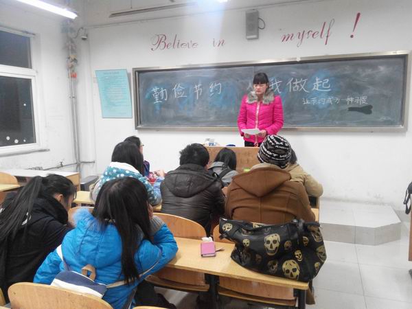2013年12月4日外国语学院基层团委社会实践部于D楼4008教室开展“倡导节约、反对浪费”大讨论活动。全体部员参加,由实践部副部长程相静主持。为进一步弘扬中华民族勤俭节约的优秀传统,基层团委社会实践部响应学院的号召在部门内部深入开展“倡导节约、反对浪费”大讨论活动。
