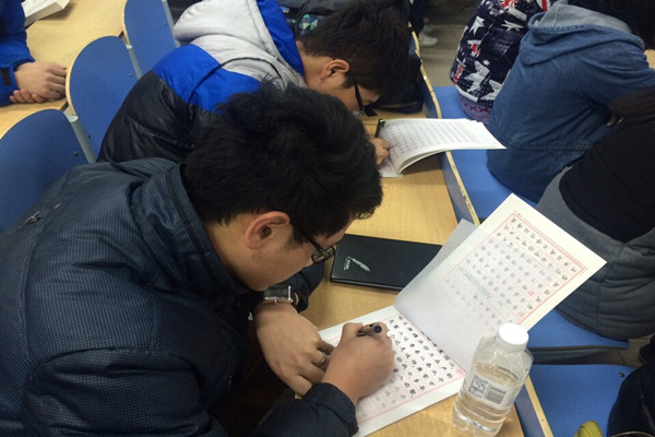 中国有句古话“人能写字,字能写人”,写字教学具有强大的潜在育人功能。为了规范同学们的书写,提高同学们的写字水平,增强同学们对祖国汉字文化的了解,文法学院于2014年12月22日18点进行硬笔书法练习活动。