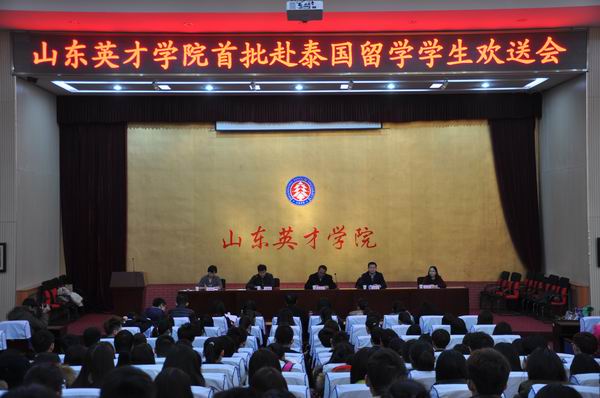 2014年12月25日,外国语与国际交流学院近300名师生,在学术报告厅为即将赴泰国留学的62名同学举行了盛大的欢送大会。山东英才学院夏季亭院长、国际交流处李建峰处长、学工部龙新良处长、泰国博仁大学李永新老师、外国语与国际交流学院张维娜院长、徐贵丽副院长、曲永存副院长出席了欢送会,此次欢送会由外国语与国际交流学院张维娜院长主持。