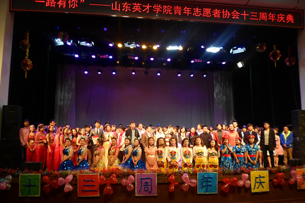 我院青年志愿者协会自2000年成立以来已经走过了十三个春秋在这十三年的风雨中,他们努力奋进,在学院领导以及各兄弟院校同仁们的共同指导下,青年志愿者协会有了今天的发展。今天,在这灯花与微笑构成的舞台,在这温馨与永恒铸成的圣地,他们纵情高歌,欢快舞蹈,共同度过了这个美好而难忘的夜晚。当主持人大声宣布:“我宣布山东英才青年志愿者协会十三周年庆典晚会现在开始!”瞬间,欢呼声、呐喊喊、掌声交织一片。开场舞《bar bar bar》,滚动着青春热火的演员带动了全场的激情,观众都high了起来。接着《汉服展示》的节目,让所有的人享受了一场视觉上的盛宴。她们身着古装向观众们展示着传统中国文化,他们是文化的传递者更是文化的志愿者!之后,节目双簧《最佳拍档》的上场,使观众都捧腹大笑。接下来大家在舞蹈《致青春》中一同感受青春,而印度舞《东巴佳丽》中妖娆动人的舞姿、炫丽闪耀的服装、悠扬迂回的音乐,营造出一种浓郁的印度风情,大家享受其中,掌声雷动!