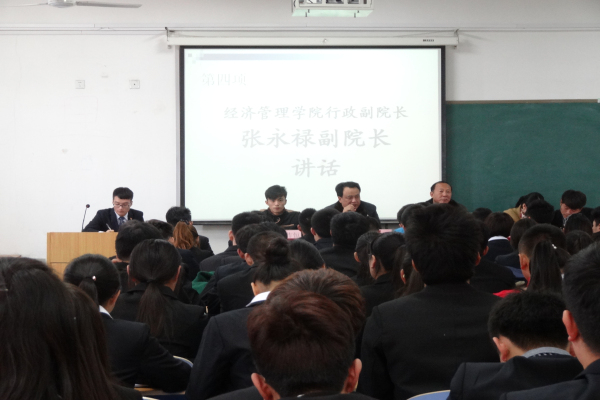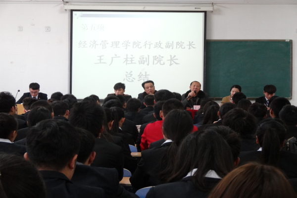 2014年12月18日中午,经济管理学院在南校区综教南楼6008教室召开基层团委学生会阶段会议,经济管理学院行政副院长王广柱和张永禄、基层团委书记赵昆、学生会主席齐放、学生会副主席李杨杨、学生会副主席、艺术团团长李作恒及各部门正副部长出席了本次会议,南校区120多名团学干部参加了会议,大会由李杨杨主席主持。
