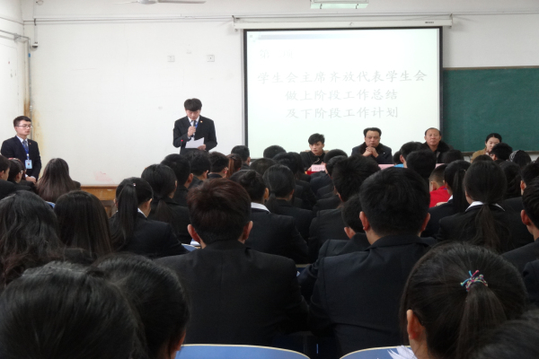 大会在庄严的国歌声中拉开了帷幕。李杨杨首先对今天召开会议的目的及作用进行了说明,简单介绍了出席领导,接着由学生会主席齐放代表学生会做了上阶段工作总结及下阶段工作计划发言,他总结回顾了2014年下半年团学纳新和培训、对队伍进行建设调整、开拓平台选拔了主席部长候选人及部长助理、开展十佳歌手以及汉字大赛等工作的落实,并对基础层团委、学生会下阶段工作进行安排和汇,他特别提到学生会接下来的工作主要以12月份师生联谊晚会和学生会干部换届选举两项为主,并希望所有团学干部们要继续做好团学工作,搞好经济管理学院南校区的团学建设。随后,基层团委书记赵昆进行讲话,赵书记指出:“团学工作要不断向“三走”方针、社会主义核心价值观、中国梦等主题靠近,以丰富大学生的学习和生活,团学干部要总结困难和工作中的不足,向其他各二级学院学习和借鉴;要养成独立性和自主性,形成严明的纪律,提高团学干部的自我修养。”